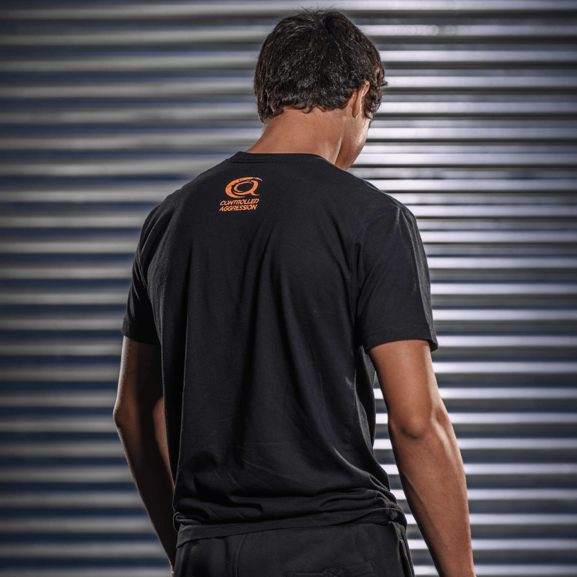 Attack with Controlled Aggression Tagline Tee. Styled in the orange brand colour with a distressed finish.
