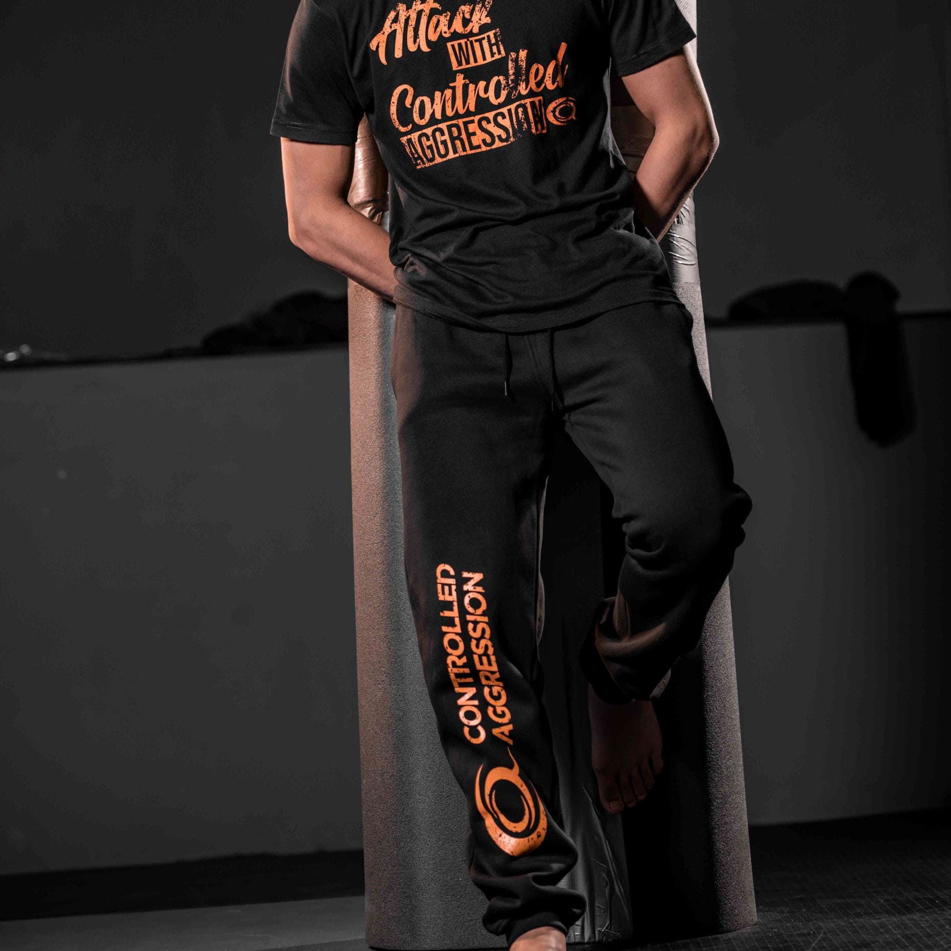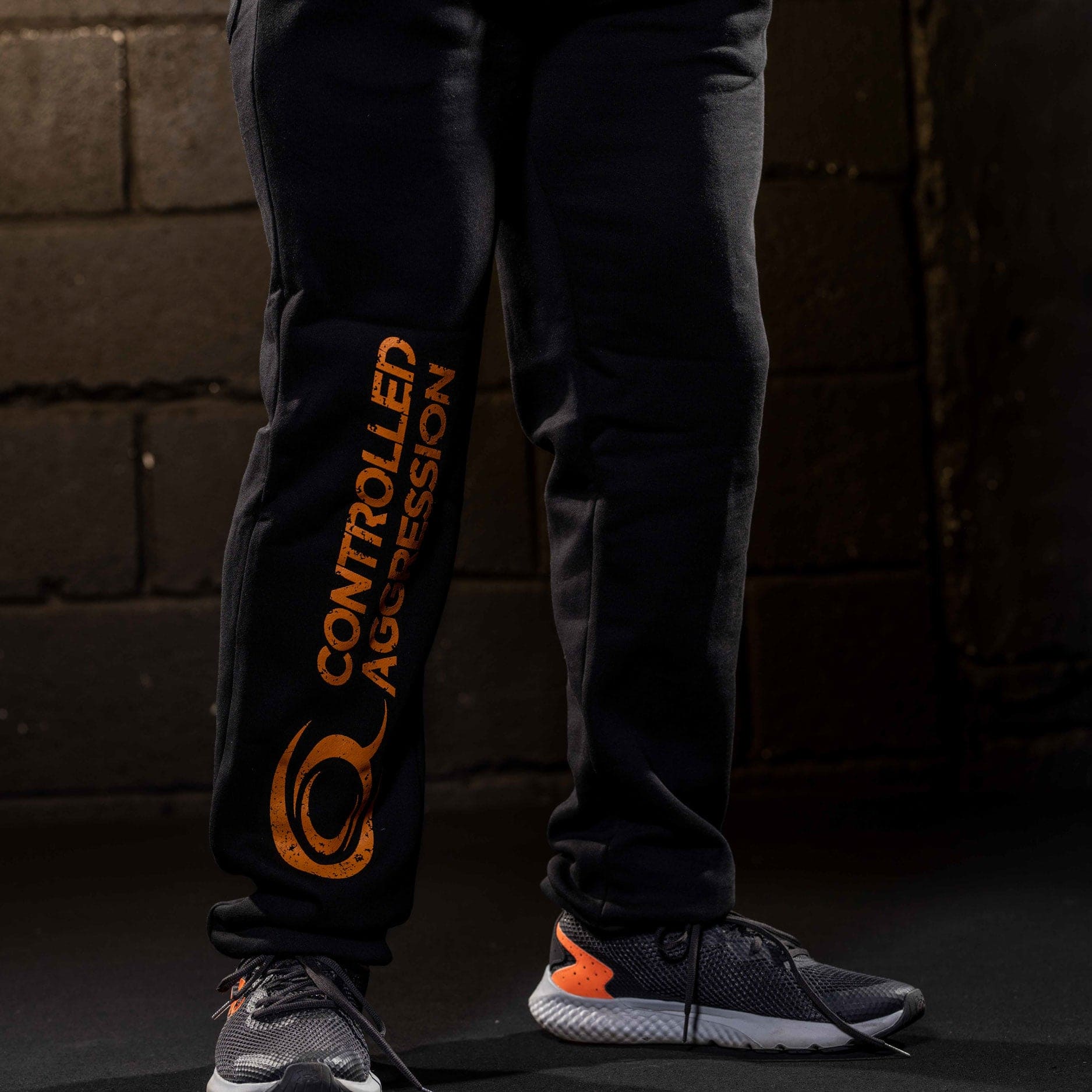 Classic heavyweight jogger style with Controlled Aggression logo printed on lower right leg. Lined inside with brushed fabric. Styled in a straight fit for a looser comfortable wear for gym wear or rest day lounge wear. Two side pockets and a closable back pocket.